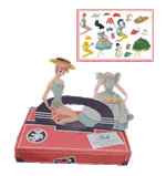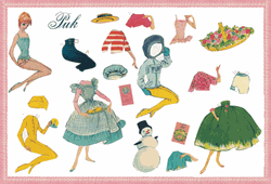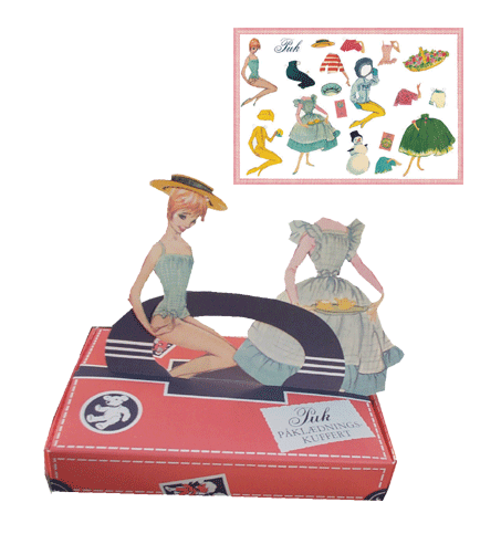 Christels populære Puk som påklædningsdukke på stort nostalgiark. Leveres sammen med genoptryk af den originale Puk - påklædningskuffert. Kufferten er udstanset og har bukkeriller . Når den samles kan Puk bo deri .